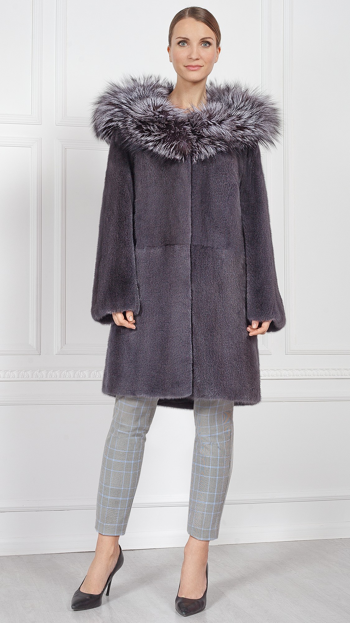 Шуба из меха норки, отделка чернобурая лиса