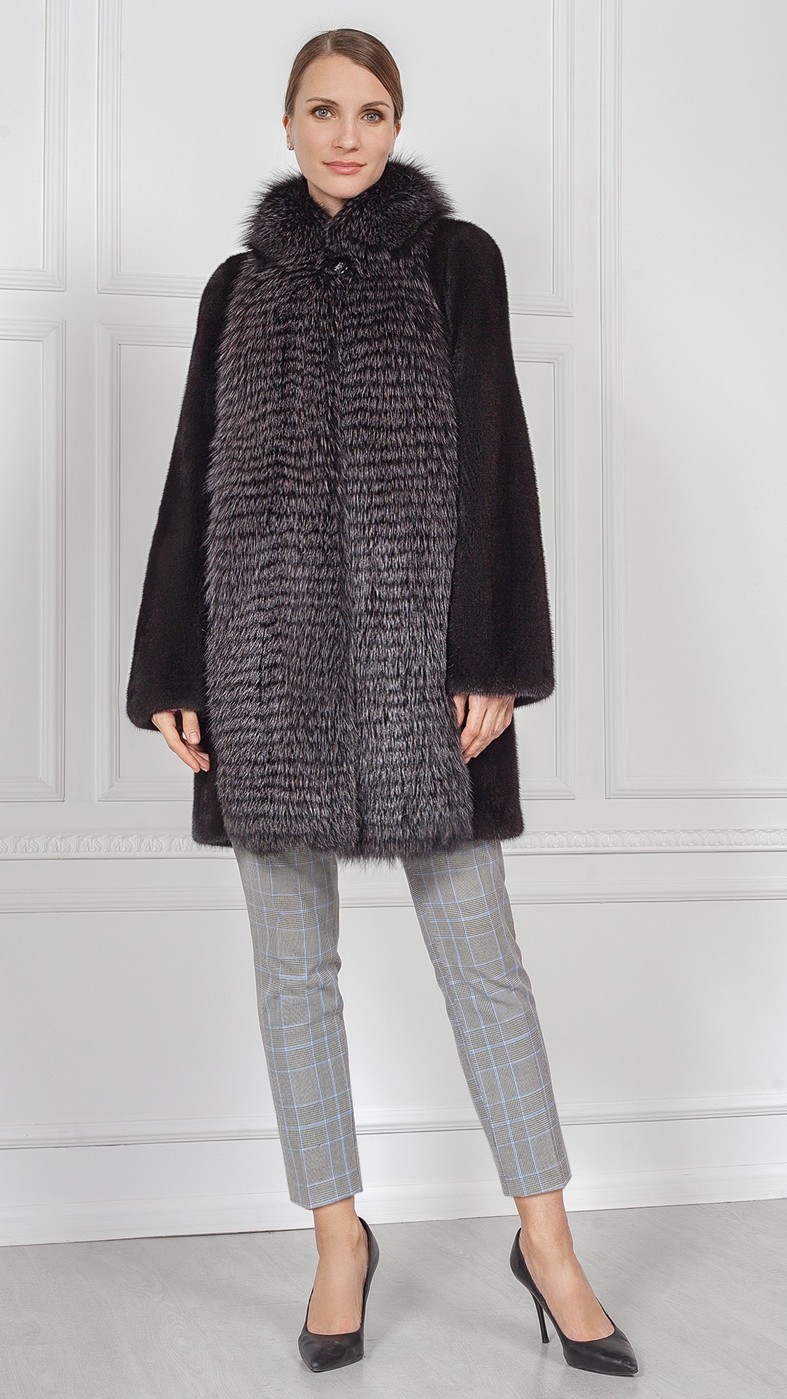 Шуба из меха норки, отделка блюфрост