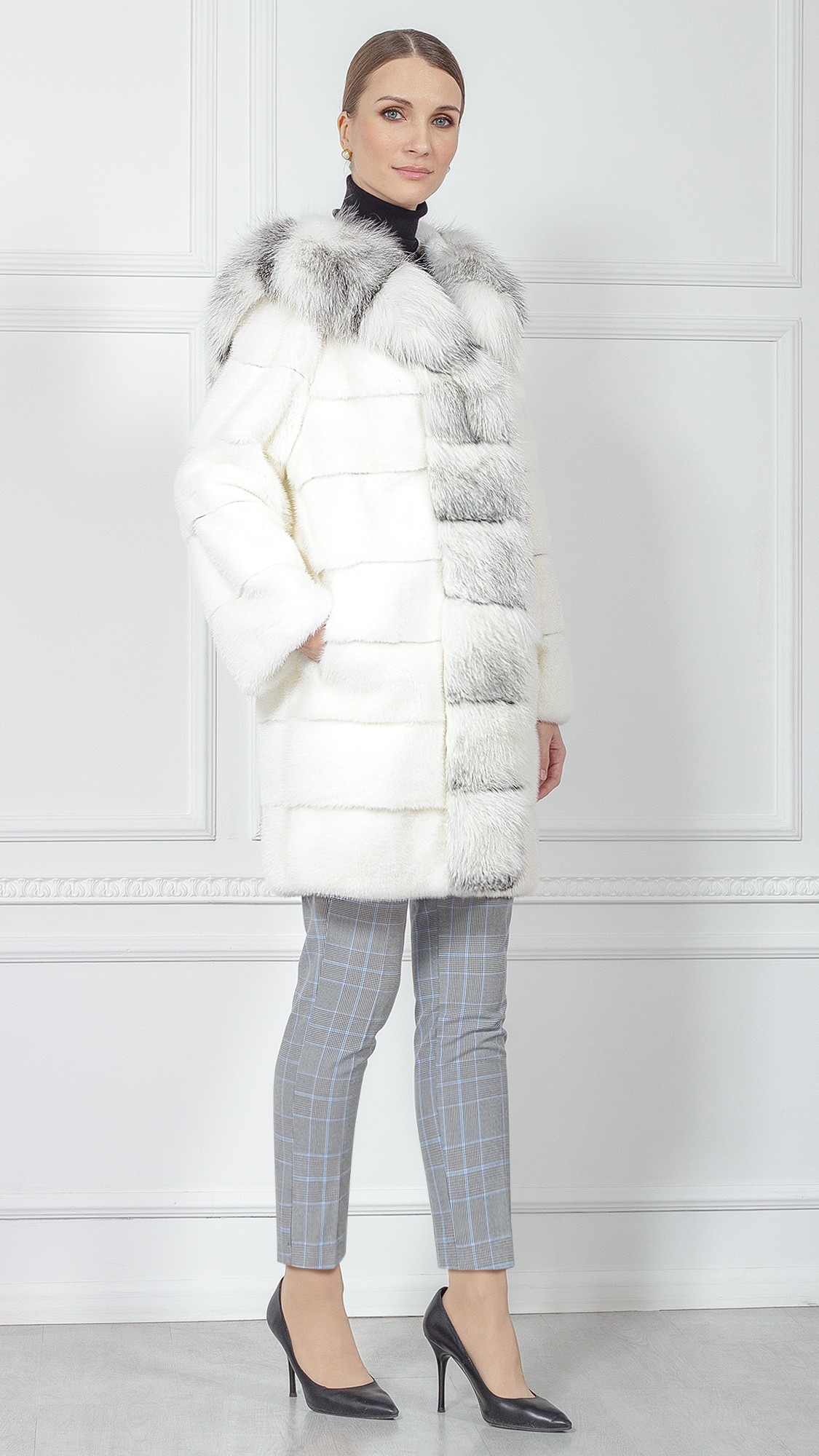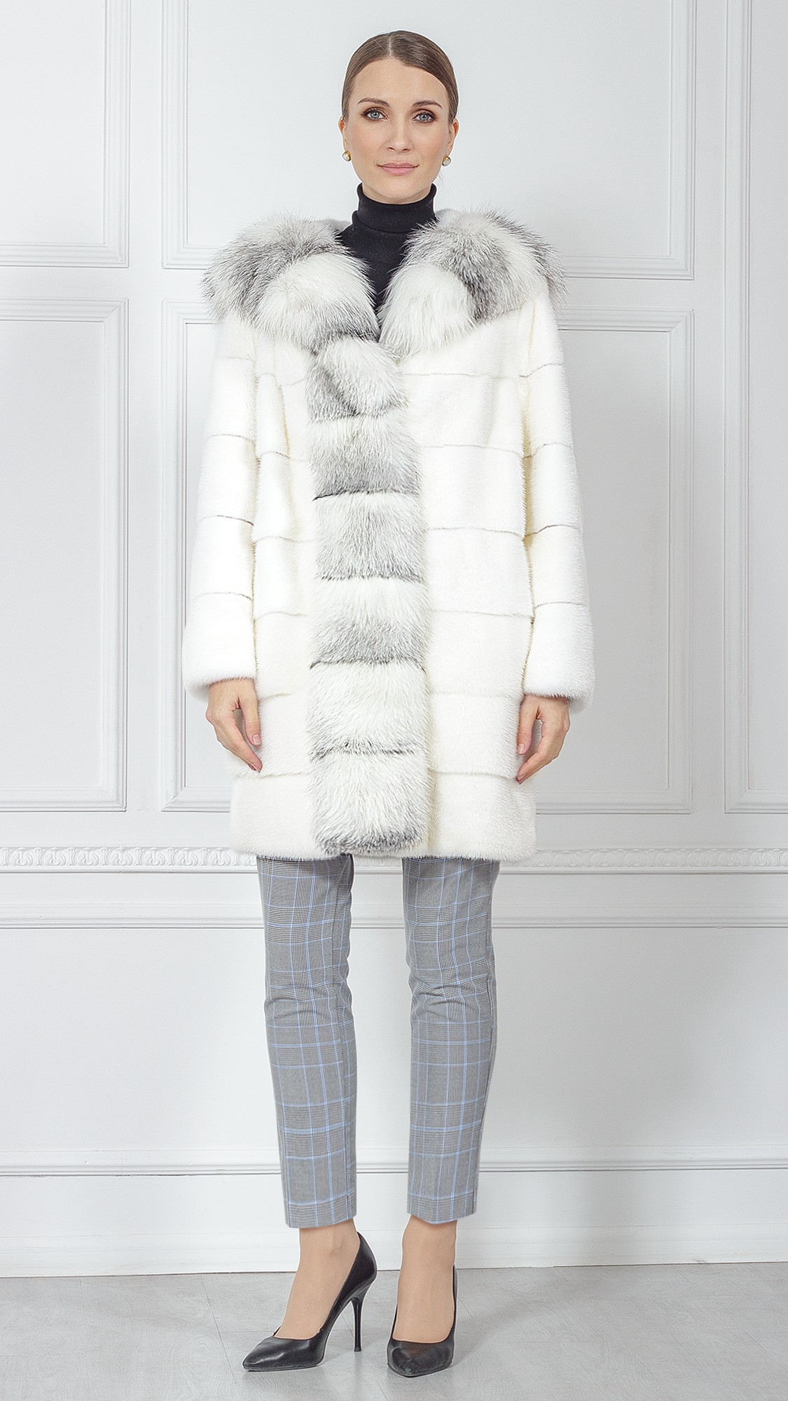 Шуба из меха норки, отделка лиса
